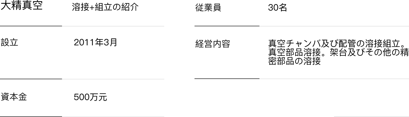 杭州大精真空技術有限公司は2010年に設立され、杭州大精機械製造有限公司の子会社であり、中日合弁企業であり、総投資額は1000万元余り、現在36人の技術従業員がおり、自動溶接機、窒素検査漏れなど20台以上の設備を持ち、主に真空胴の溶接組立、真空管継手の製造に従事しており、主な顧客は日本神鋼グループ、日立グループ、ウォールカグループなどである。