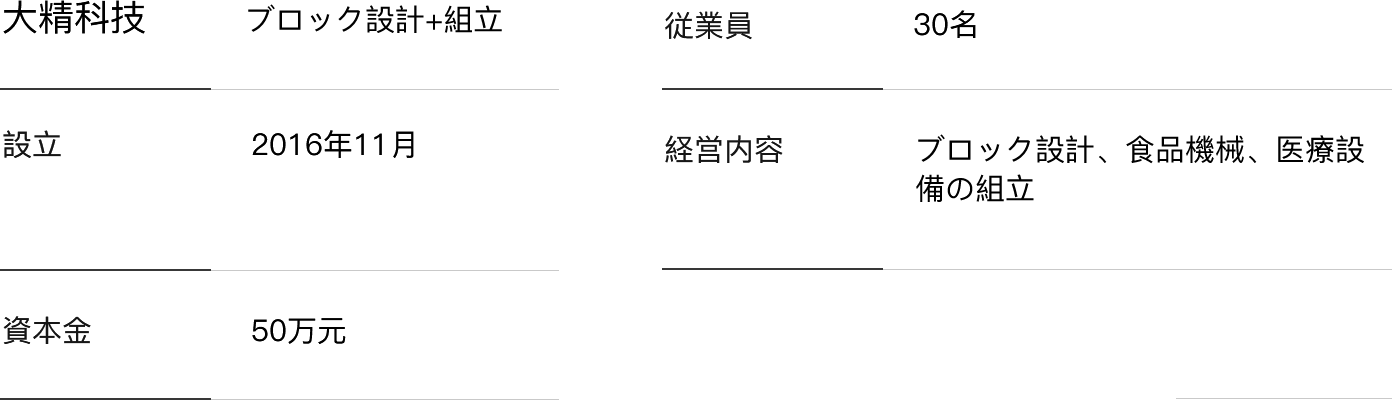 大精科技は主に設計、組立業務に従事し、大精機械部品加工のプラットフォーム及び自身の専門組立技術、設計、機電購買チームに基づいて、顧客にワンストップサービスを提供し、顧客のコストとリスクを下げ、有効なセットサービスを提供した。現在は主にドイツやイタリアなどの顧客である。