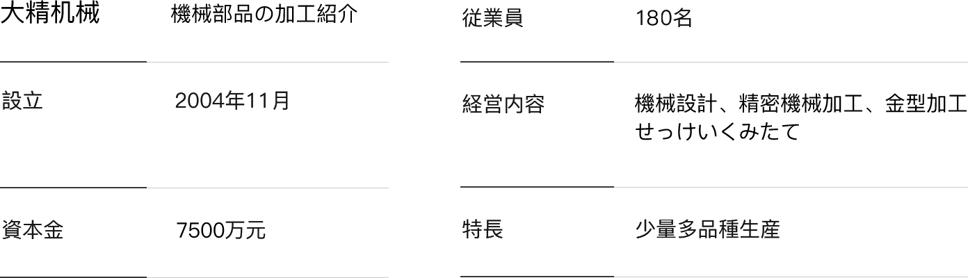 杭州大精機製造有限公司は2004年に設立され、現在登録資本金は2500万元、総投資額は7500万元で、現在180人の技術従業員がおり、輸入五軸加工センター、龍門加工センター、NC旋盤、横型加工センター、研削盤など60台以上の生産設備を持っている。主に精密機械部品の加工から顧客ニーズに応じた組立サービス方式までを行うハイテク企業に従事している。製品は主に薬品、食品包装設備の核心部品、半導体チップ検査の設備精密部品及び液晶生産ライン搬送ロボットの精密部品及び真空設備上の精密部品を分布している。
